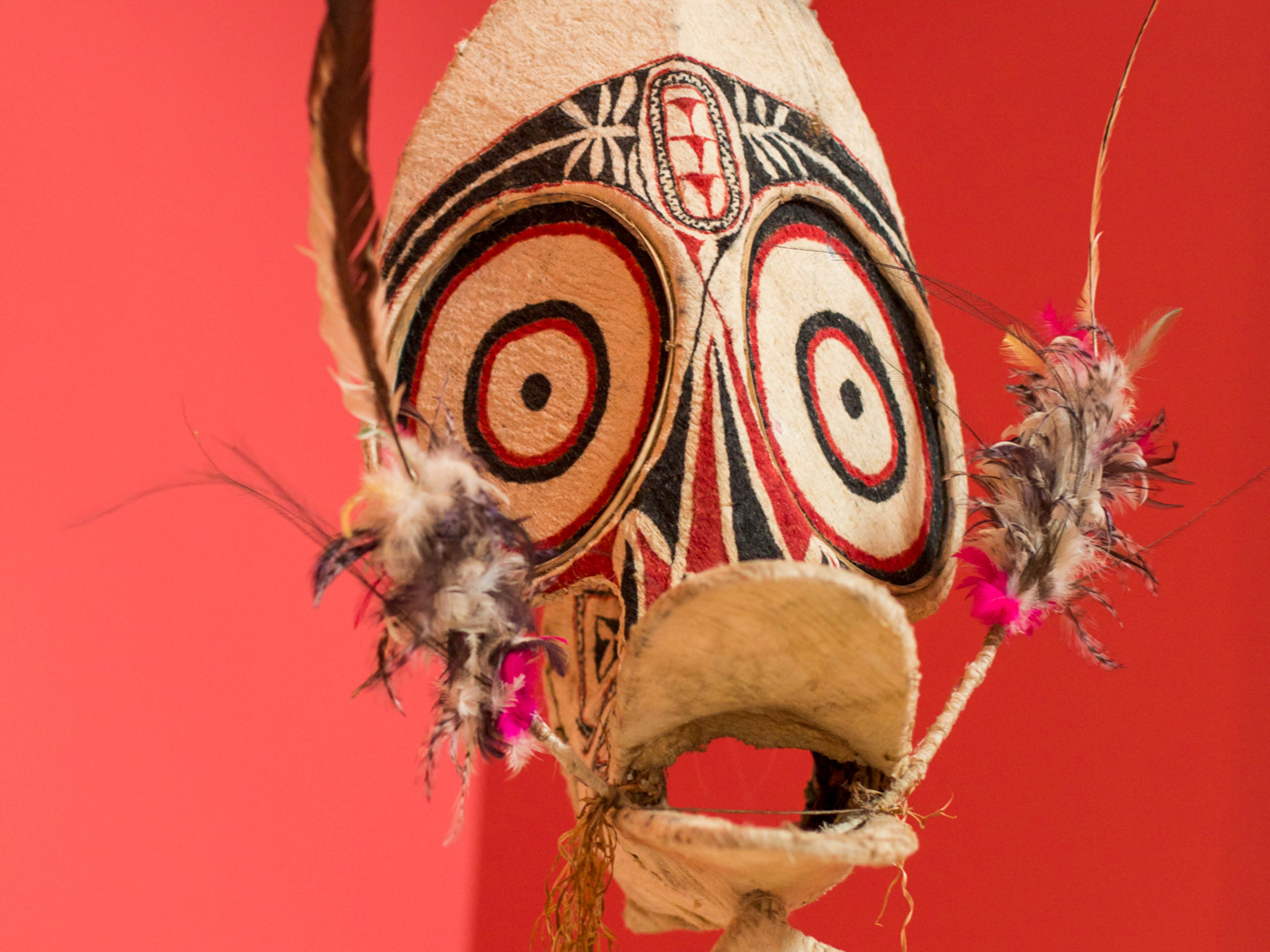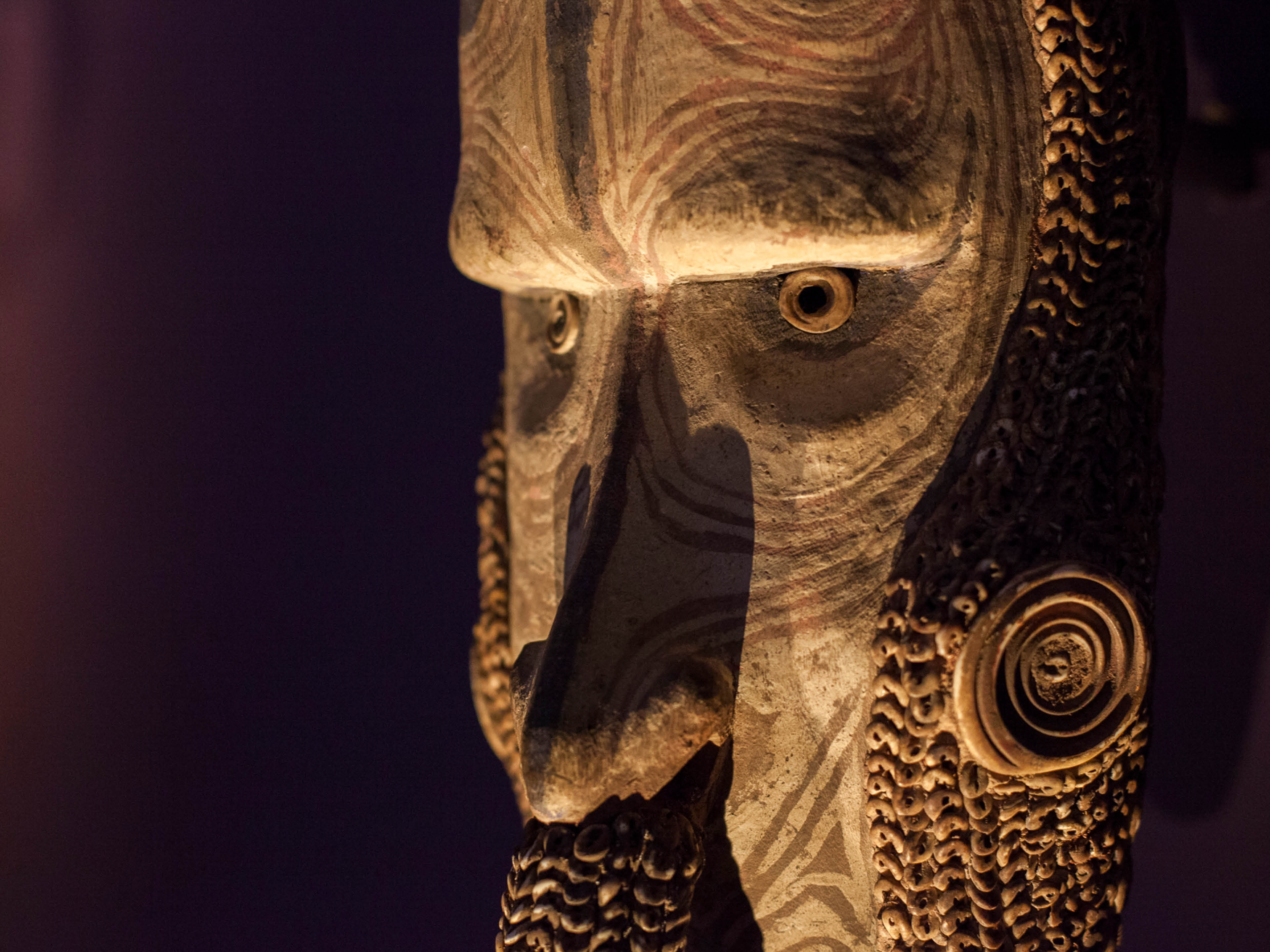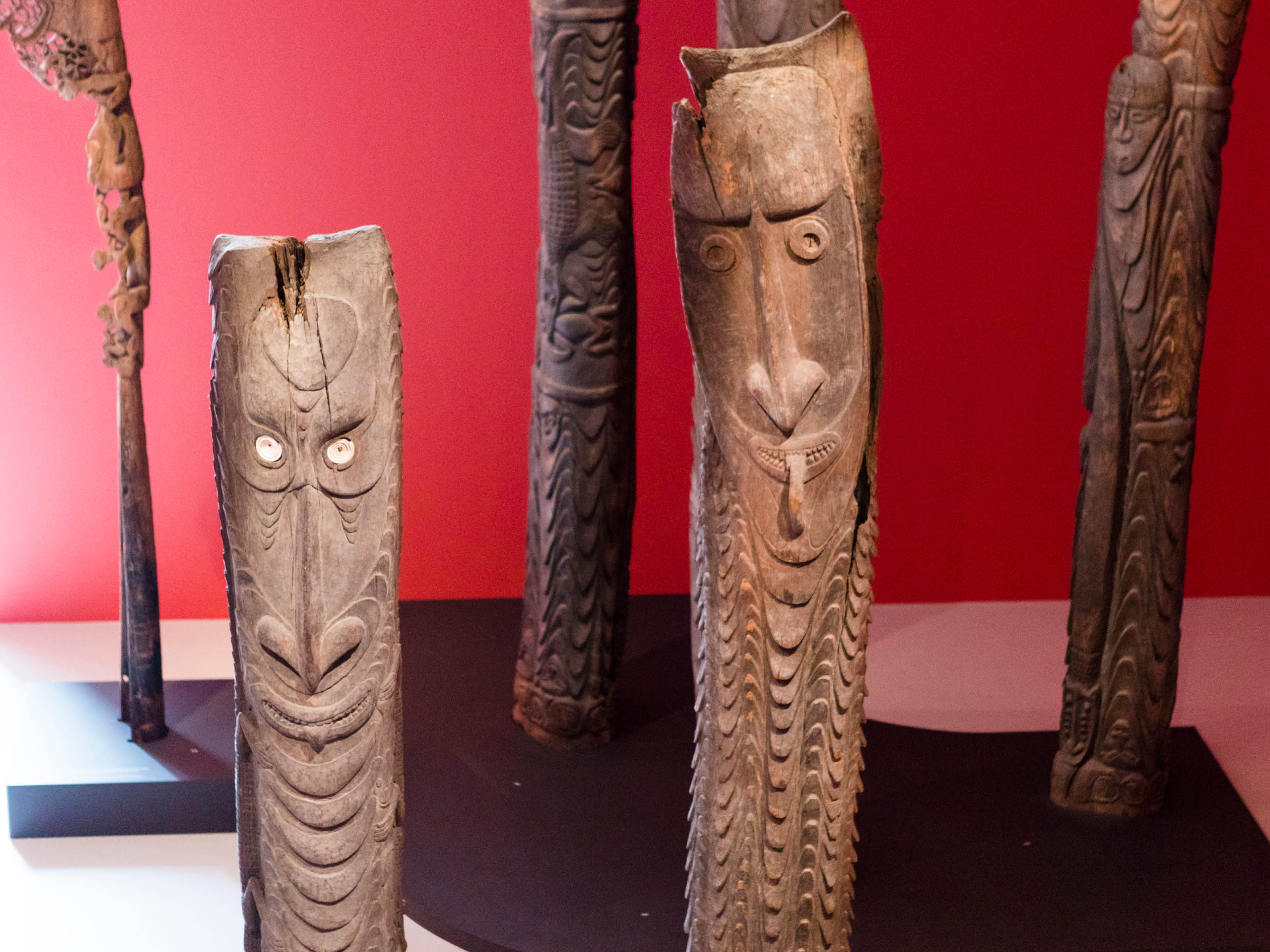 Eintreten, den Kopf in den Nacken legen und hoch schauen zum grössten Objekt im Haus: Das Kulthaus der Abelam, einer Bevölkerungsgruppe aus Papua-Neuguinea, eröffnet die Ausstellung auf höchstem Niveau. Grosses hat den Menschen schon immer fasziniert. Deshalb wird nach Grösse gestrebt. Hauspfosten aus Papua-Neuguinea machen grossen Eindruck. Sie sind riesige Zeugen dafür, was technisch und in Teamarbeit möglich ist. Sie und weitere überdimensionale Objekte wie ein Fächer oder ein Vorratsgefäss zeigen aber auch die Unhandlichkeit auf, zu der Wetteifer führen kann.