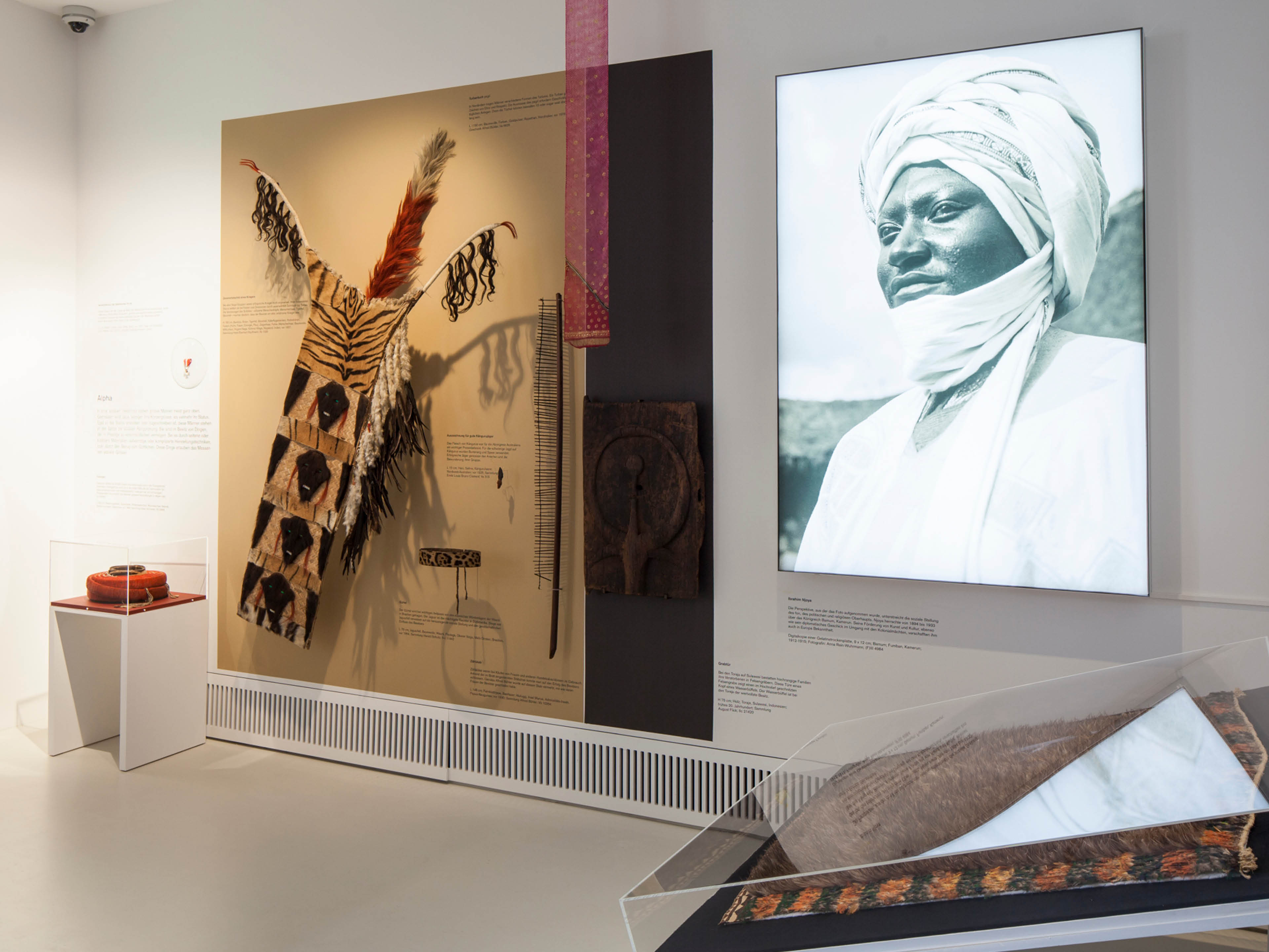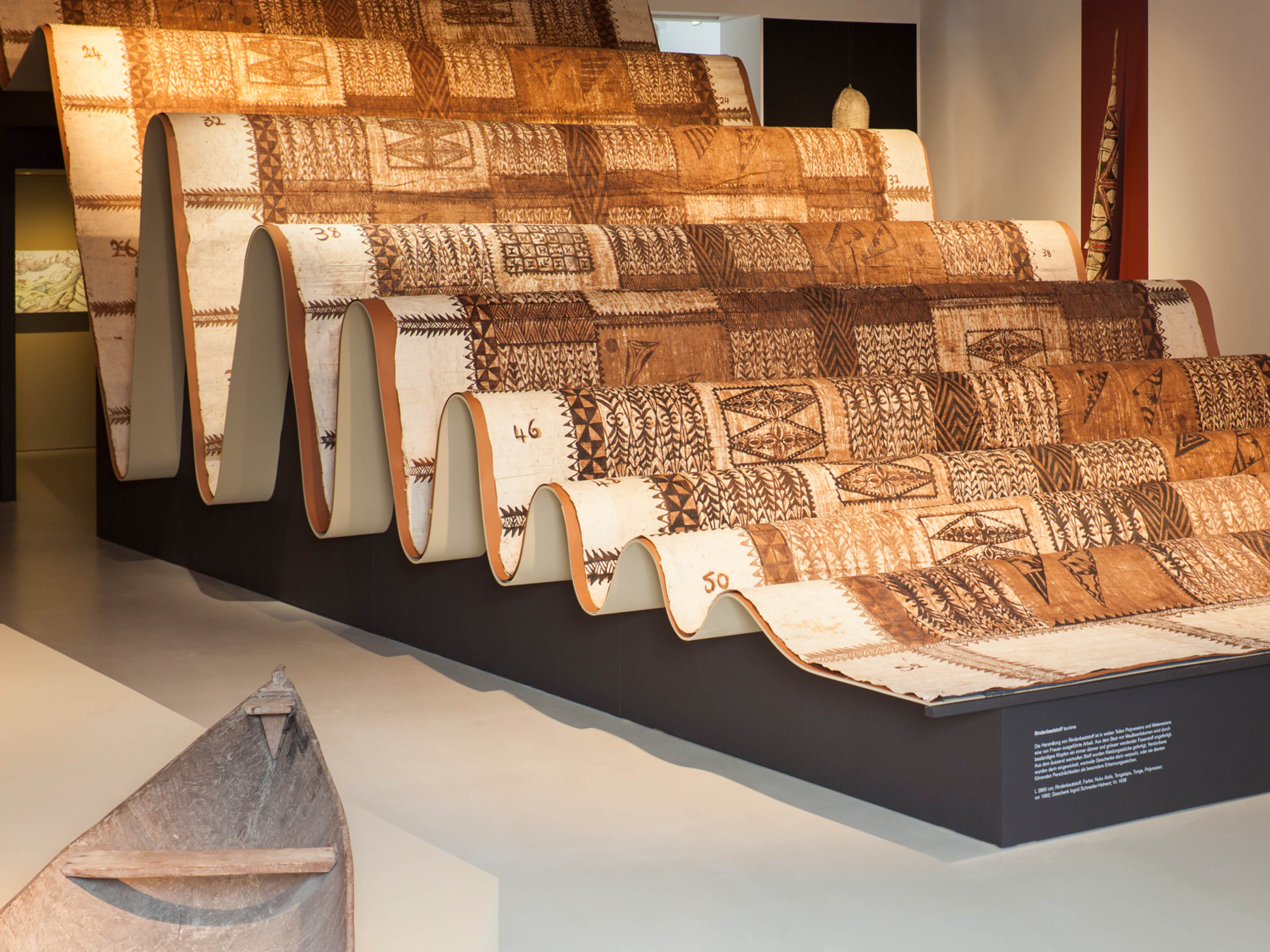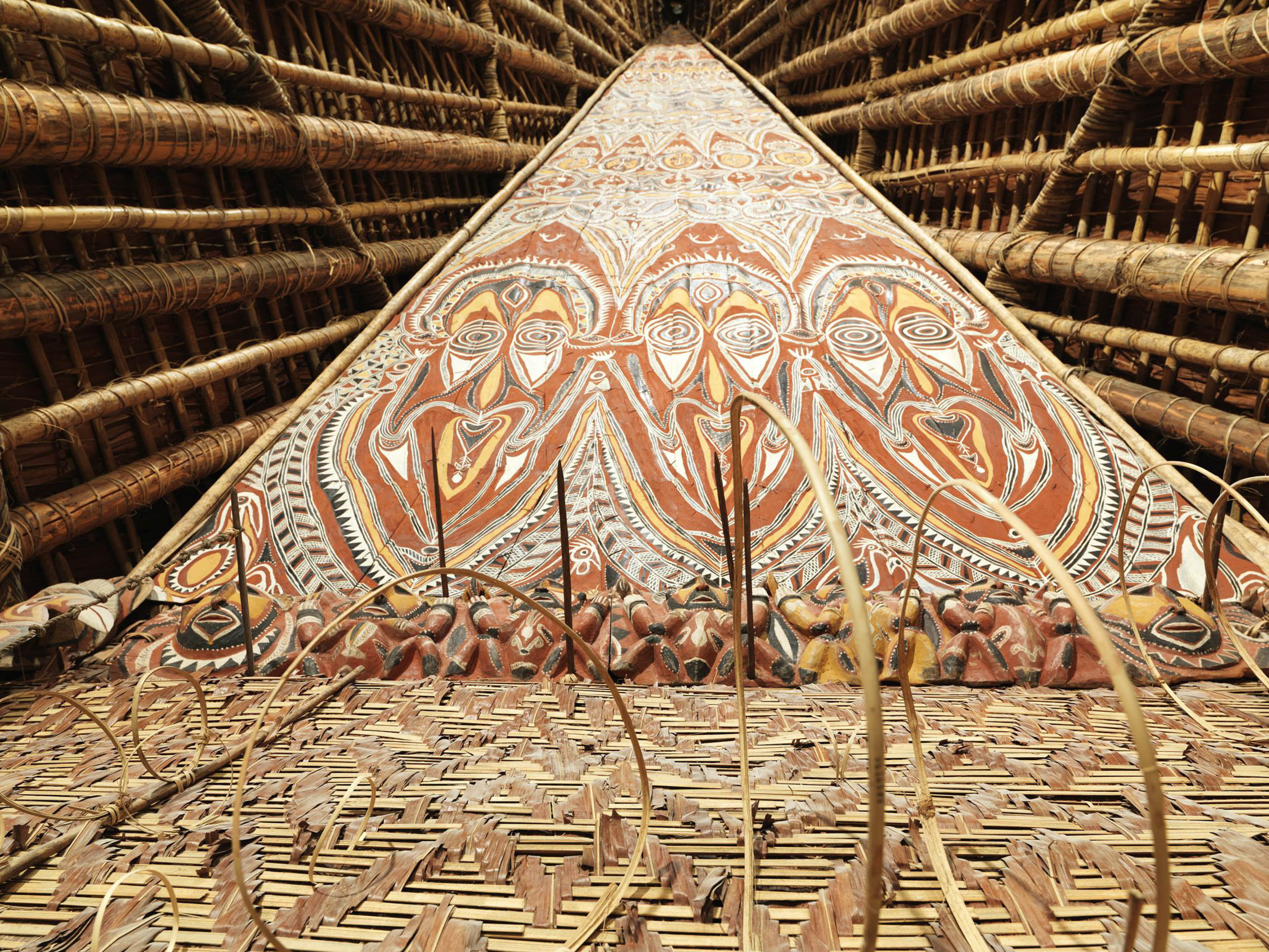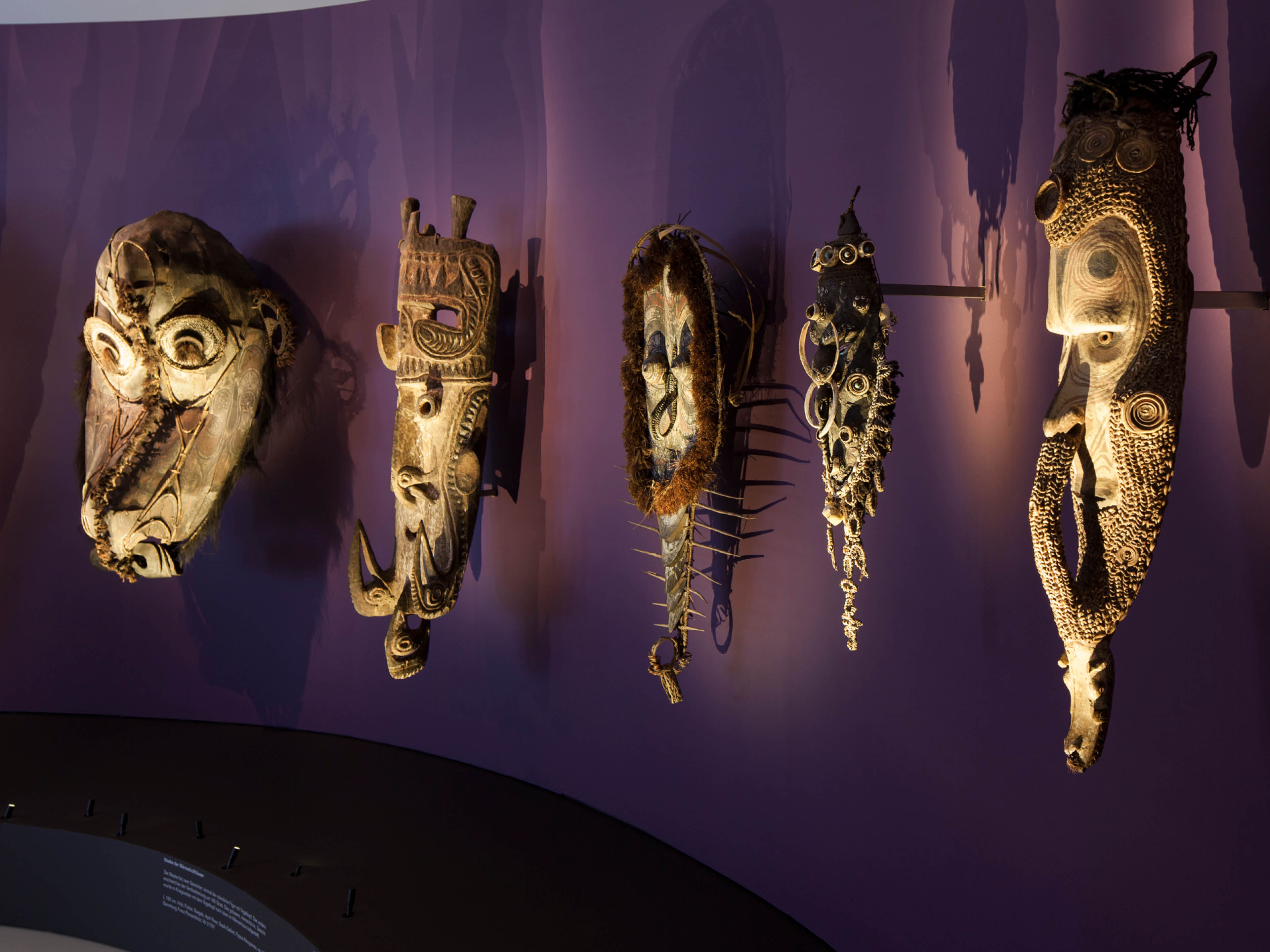 Eintreten, den Kopf in den Nacken legen und hoch schauen zum grössten Objekt im Haus: Das Kulthaus der Abelam, einer Bevölkerungsgruppe aus Papua-Neuguinea, eröffnet die Ausstellung auf höchstem Niveau. Grosses hat den Menschen schon immer fasziniert. Deshalb wird nach Grösse gestrebt. Hauspfosten aus Papua-Neuguinea machen grossen Eindruck. Sie sind riesige Zeugen dafür, was technisch und in Teamarbeit möglich ist. Sie und weitere überdimensionale Objekte wie ein Fächer oder ein Vorratsgefäss zeigen aber auch die Unhandlichkeit auf, zu der Wetteifer führen kann.