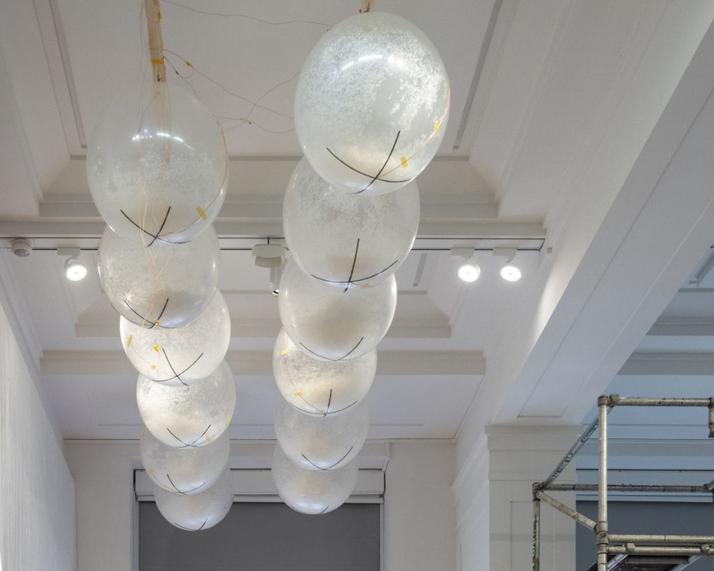 An der Saaldecke hängen 12 weisse Ballons in zwei Reihen