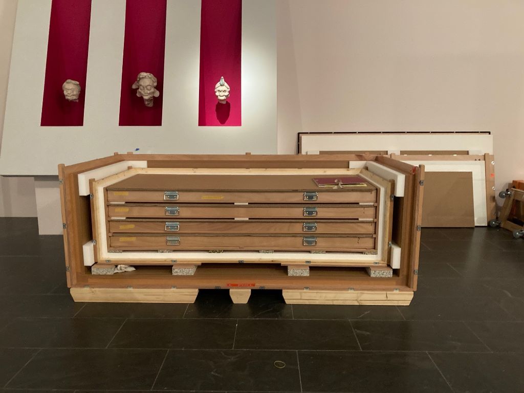 Dort blieben sie einfach mal in einem sicheren Raum stehen. Damit sich die Hölzer ans Klima anpassen konnten. Am Dienstagmorgen wurden die Kisten auf einen riesigen Rolli geladen und durch die vielen, kilometerlangen, unterirdischen Gänge und in vielen Warenliften in die Ausstellungsräume transportiert, wo die Kisten dann aufgemacht wurden. Alle waren gespannt, besonders auch Kuratorin und Co-Kuratorin der Ausstellung. Alles war gut angekommen, dank allen Profis, die involviert gewesen waren, wie Huber betonte.