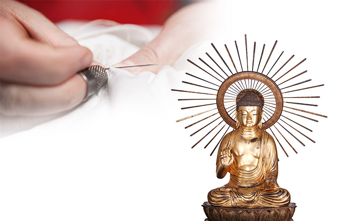 In Japanese Buddhism, the monk's robe (kesa), pieced together from sundry patches, plays a significant role. Basically, the patchwork stands for the non-adherence to worldly things and for poverty. In Japan, the kesa is also regarded as a symbol of Buddhist teaching and is bestowed upon a pupil by his master to mark that he has gained full understanding of the teachings. The robe also played an important part in politics. It was given by the emperor to an abbot of a monastery as a sign of clerical power and brought with it a range of secular and fiscal privileges.