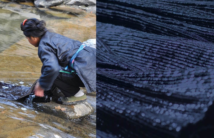 Die magisch wirkenden Gewebe weisen drei besondere Merkmale auf: der nachtblaue, fast schwarze Indigo-Farbton, die zahllosen Falten, die dem Stoff eine skulpturale Steifigkeit verleihen und der metallische Glanz. Die Stoffe werden von den Miao-Frauen in Handarbeit hergestellt. Das Wissen um die unzähligen Arbeitsschritte wird von Generation zu Generation weitergegeben.